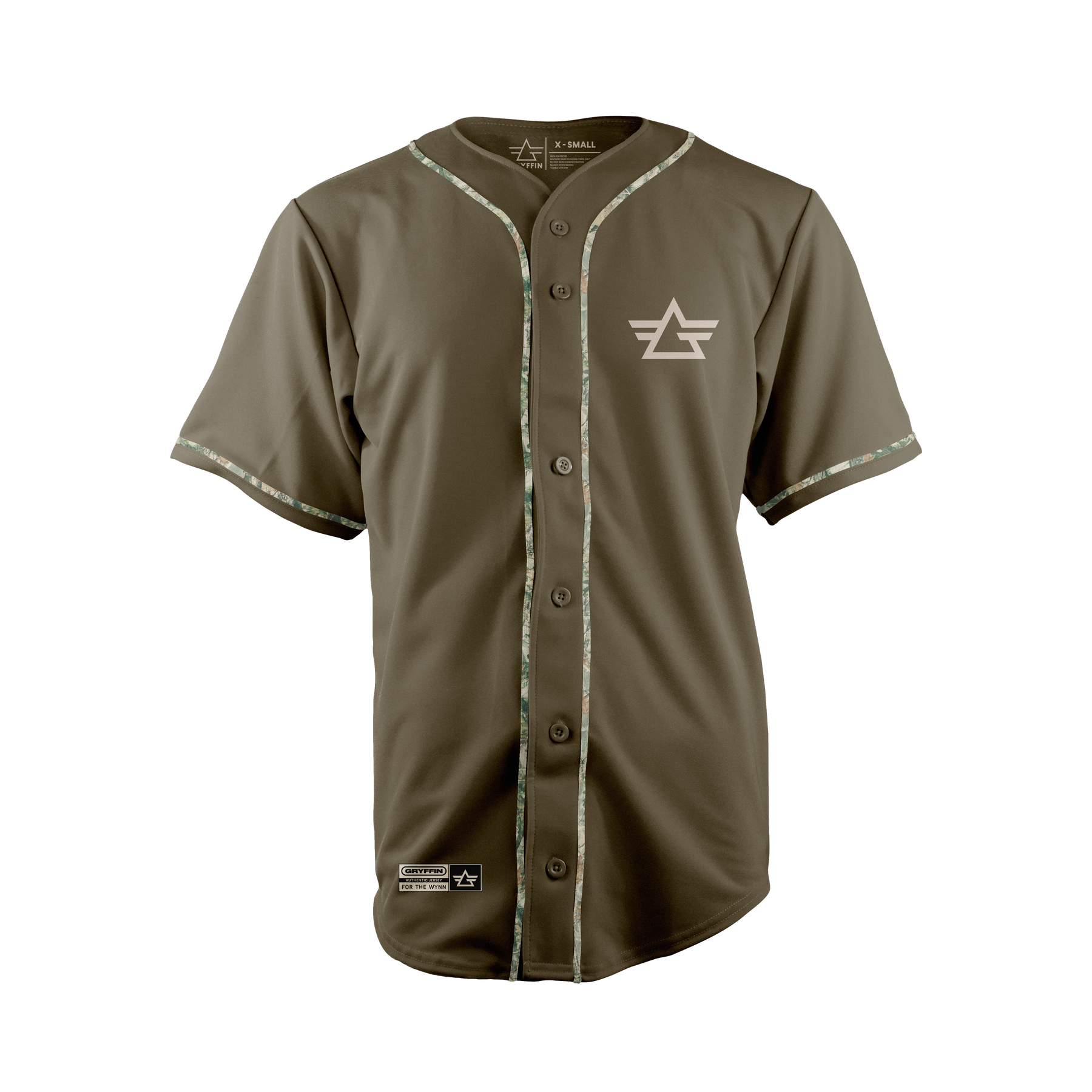 Gryffin olive colored jersey with deadwood camo trims. Made in the USA.